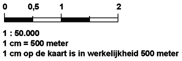 1 cm op de kaart is in werkelijkheid 500 000 cm (= 5 km).